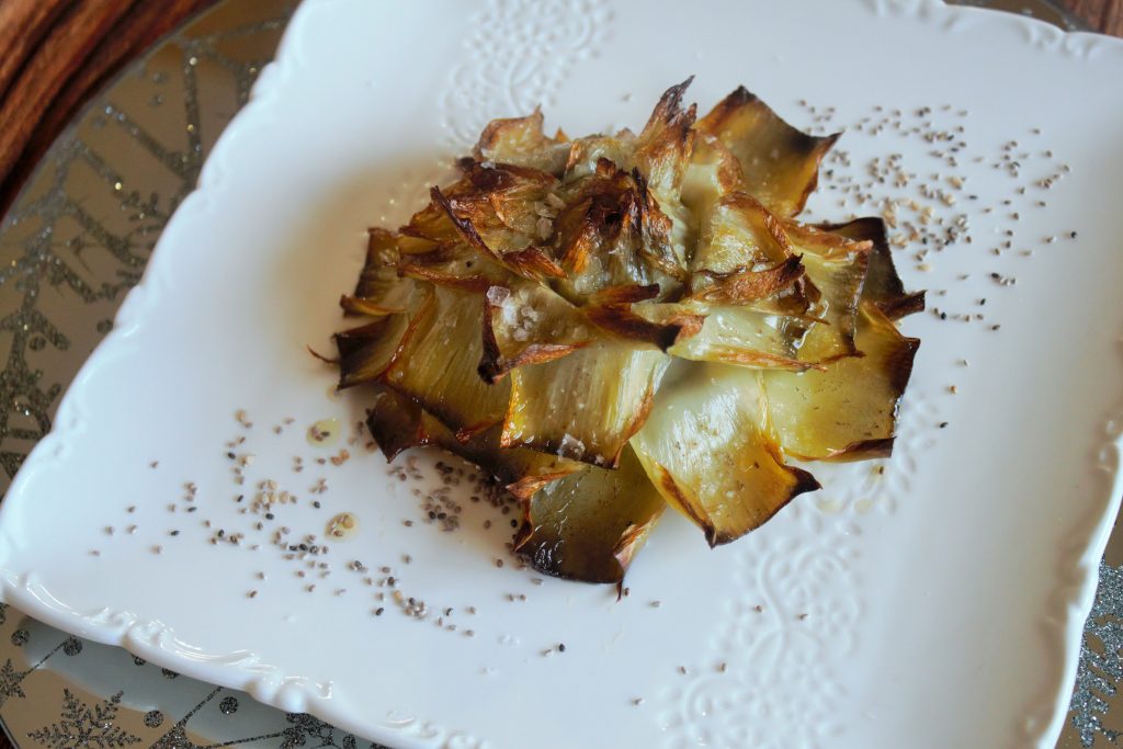 - Vamos abriendo la alcachofa, con mucha delicadeza y hoja por hoja.