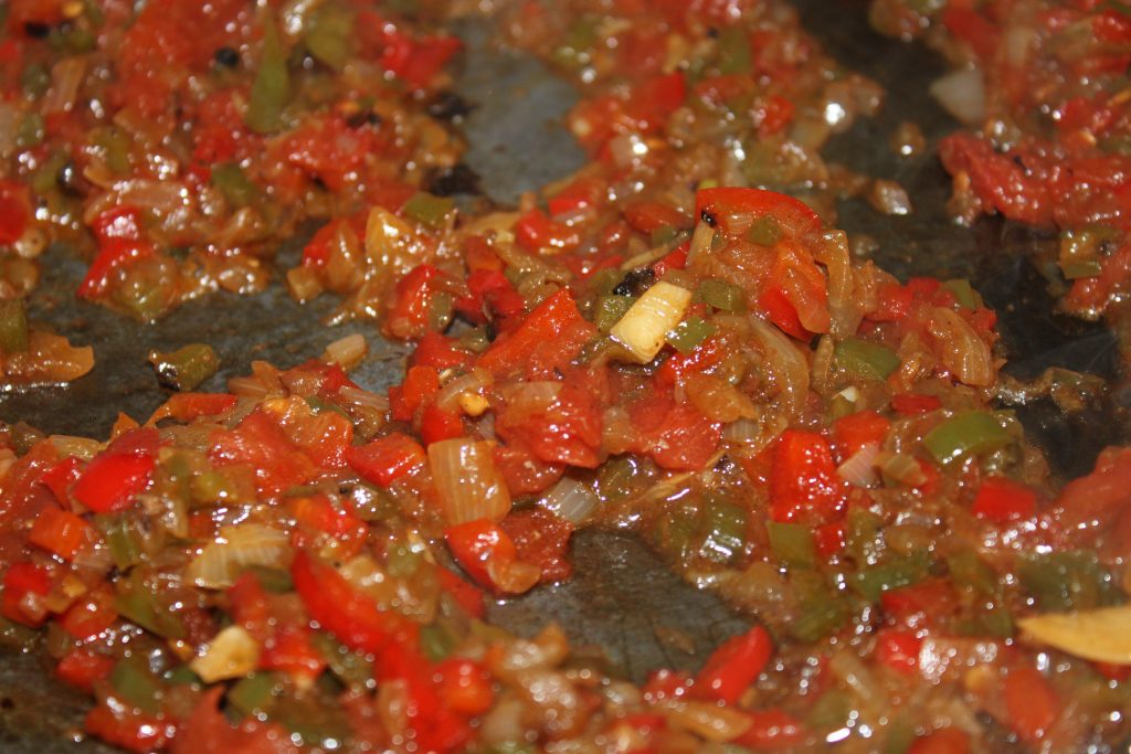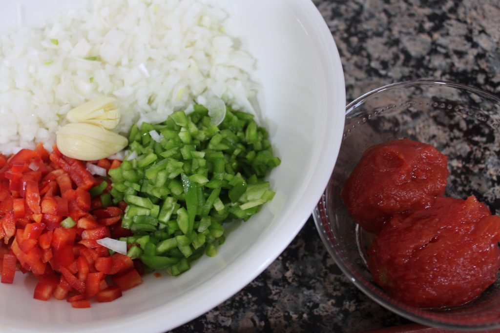 Ahora hacemos el sofrito. Añadimos la cebolla y los pimientos picados. Cocinamos a fuego lento.