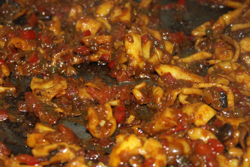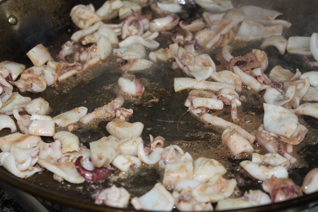 Añadimos el calamar y la sepia troceada, cuando esté dorada añadimos los dientes de ajo picados. La reservamos.