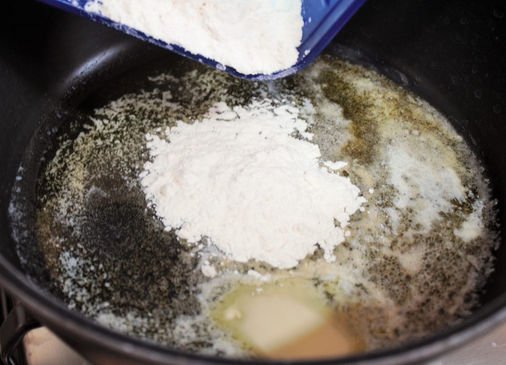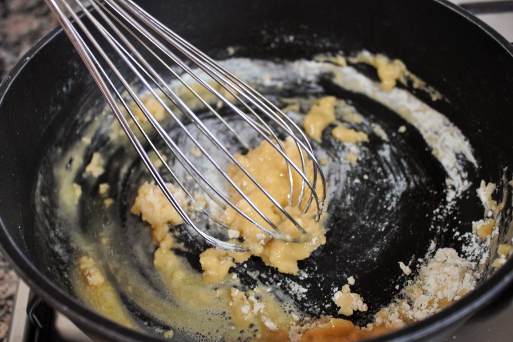 • Removemos y dejamos que la harina se tueste un poco.