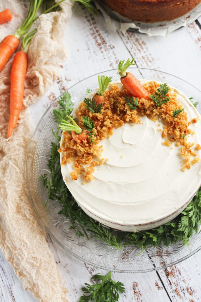 - Decoramos desmenuzando un resto de bizcocho que tengamos (la tapadera abombada del bizcocho) a modo de tierra y cortando unas zanahorias pequeñas colocándolas como si nacieran del pastel.