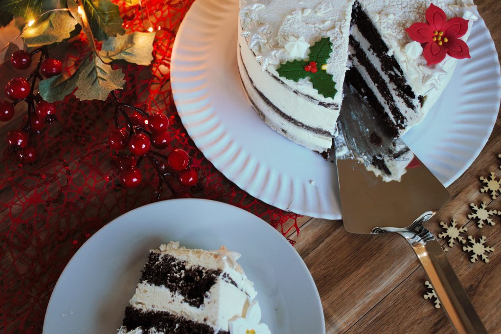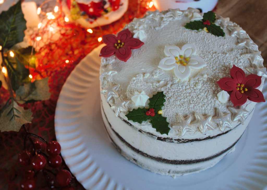 - Por ultimo decoramos con lo que más nos guste, en este caso yo le he añadido unas flores de Navidad y estrellas de glasa y un poco de spray comestible efecto terciopelo en la base. Pero podríamos hacer cualquier decoración con boquillas y manga pastelera, sprinkles, ect.