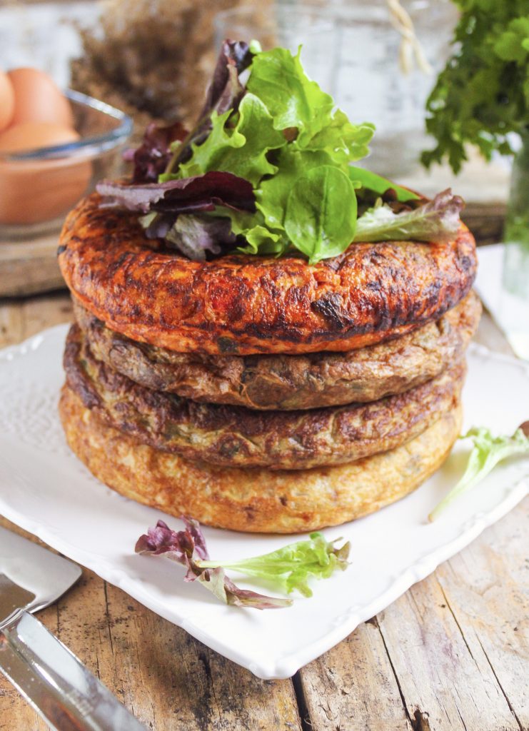 • Busca un plato de cerámica bonito y vamos a construir el pastel : Coloca la Tortilla de Patata. Es la más firme y la que dará estabilidad a todo el conjunto. Añade la tortilla de calabacín y berenjena. Incorpora la tortilla de alcachofas. Termina con la tortilla de sanfaina. Deja que su color rojizo y vibrante sea el protagonista y corone este edificio de sabor.