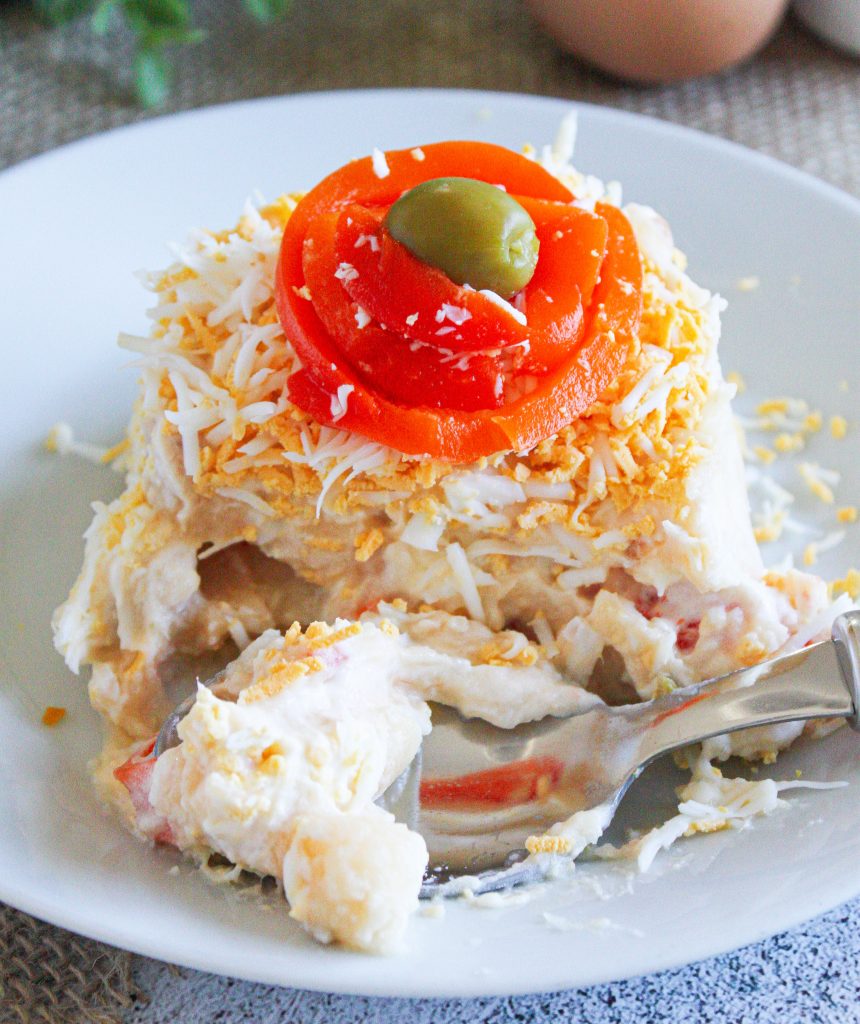 • Pintamos el exterior con mayonesa y decoramos con huevo duro rallado muy fino y tiras de pimiento rojo.