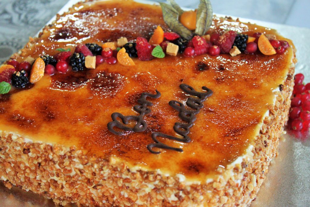 Es importante quemar el pastel en frio para que no se deshaga la nata. Es muy delicado. - Finalmente decoramos a nuestro gusto, yo he utilizado crocanti de almendras en los laterales y frutas para decorar la tarta.