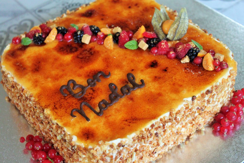 14. Añadimos a nuestra tarta la yema , espolvoreamos con azúcar de caña y quemamos con un soplete o quemador.