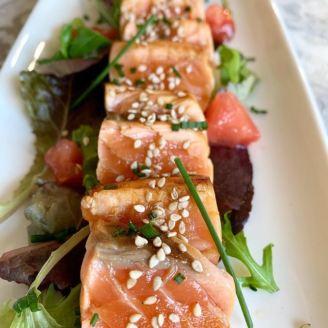 - Añadimos guarnición al gusto. En este caso yo he colocado unos brotes tiernos aliñados con salsa oriental debajo del tataki.