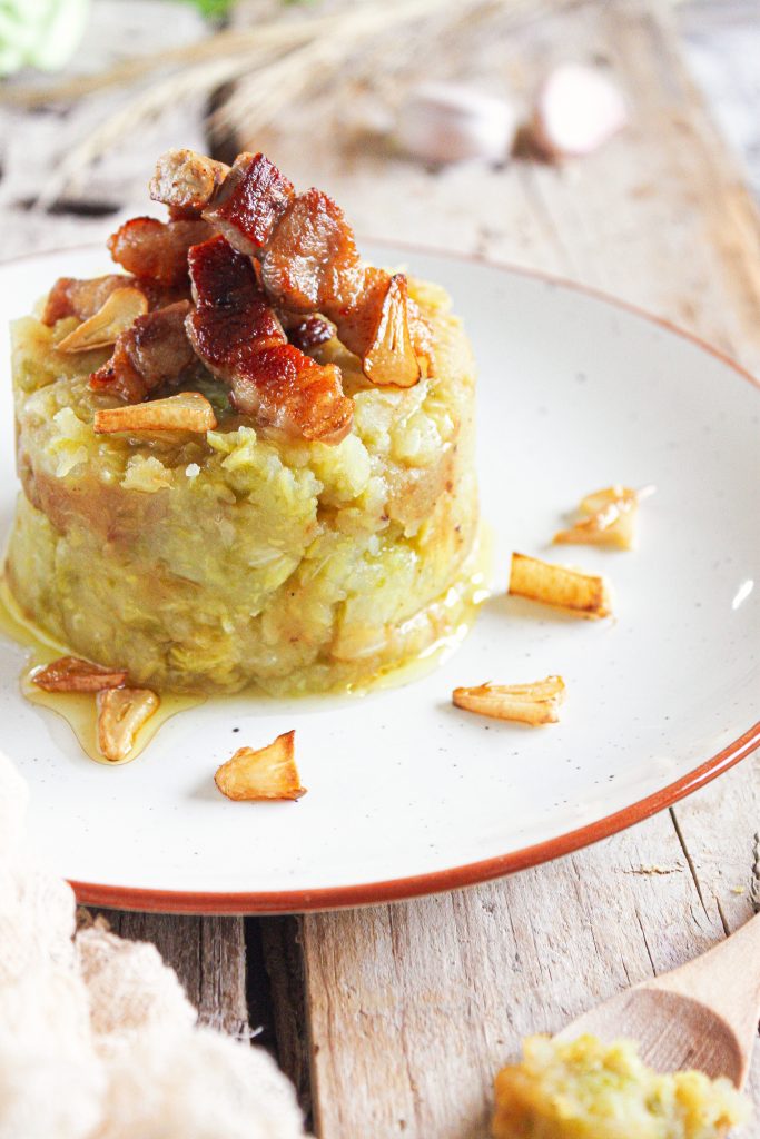• Cuando esté dorado, emplatamos junto a los dientes de ajo y la panceta salteada.